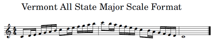 Scales: Please prepare 2 major scales of your choice as many octaves as you are comfortable using the Vermont All State Major Scale format at a minimum of Quarter Note = 88 beats per minute.